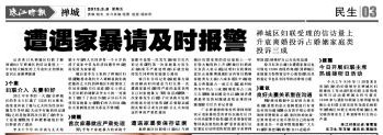 时值“三八”妇女节,《珠江时报》2013年03月08日C03版就妇女受到家庭暴力事件进行专题报道,其中访问到我所周妍律师关于妇女受到家庭暴力后应如何取证的问题,周妍律师表示:“家暴的受害者应在被打后24小时内报警并验伤,受害者要保存报警回执及验伤结果,严重者需进行法医鉴定以证明受伤程度,并寻求律师帮助,以便维护自己合法权益。”