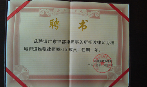 - 我所杨波律师受聘为桂城街道维稳律师顾问团成员