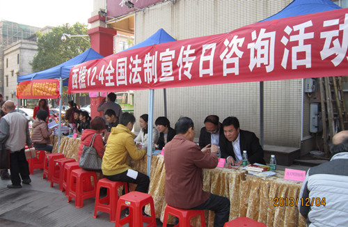 2013年12月4日上午,南海区司法局、西樵镇司法所在西樵登山大道旁的金典广场开展了“2013年12·4全国法制宣传日户外法律宣传活动”。现场主要包括法律咨询、法律知识有奖问答、法律知识宣传资料的派发等活动。